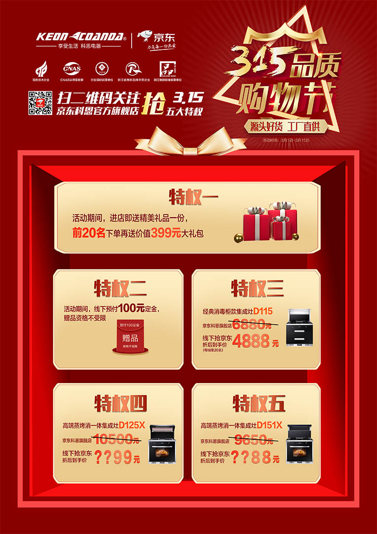 集成灶十大品牌、廚電行業(yè)十大品牌科恩電器315品質(zhì)購物節(jié),3月1日至3月15日活動期間,關(guān)注京東科恩官方旗艦店搶3.15五大特權(quán)!特權(quán)一:凡進(jìn)店客戶,即送精美禮品一份,前20名下單再送價(jià)值399元大禮包;特權(quán)二:活動期間線下預(yù)付100元定金,贈品資格將不受限;特權(quán)三:經(jīng)典消毒柜款集成灶D115京東科恩旗艦店6880元,線下?lián)尵〇|折后到手價(jià)4888元;特權(quán)四:高端蒸烤消一體集成灶D125X、D151X線下?lián)尵〇|折后到手價(jià)低到你不能想象!