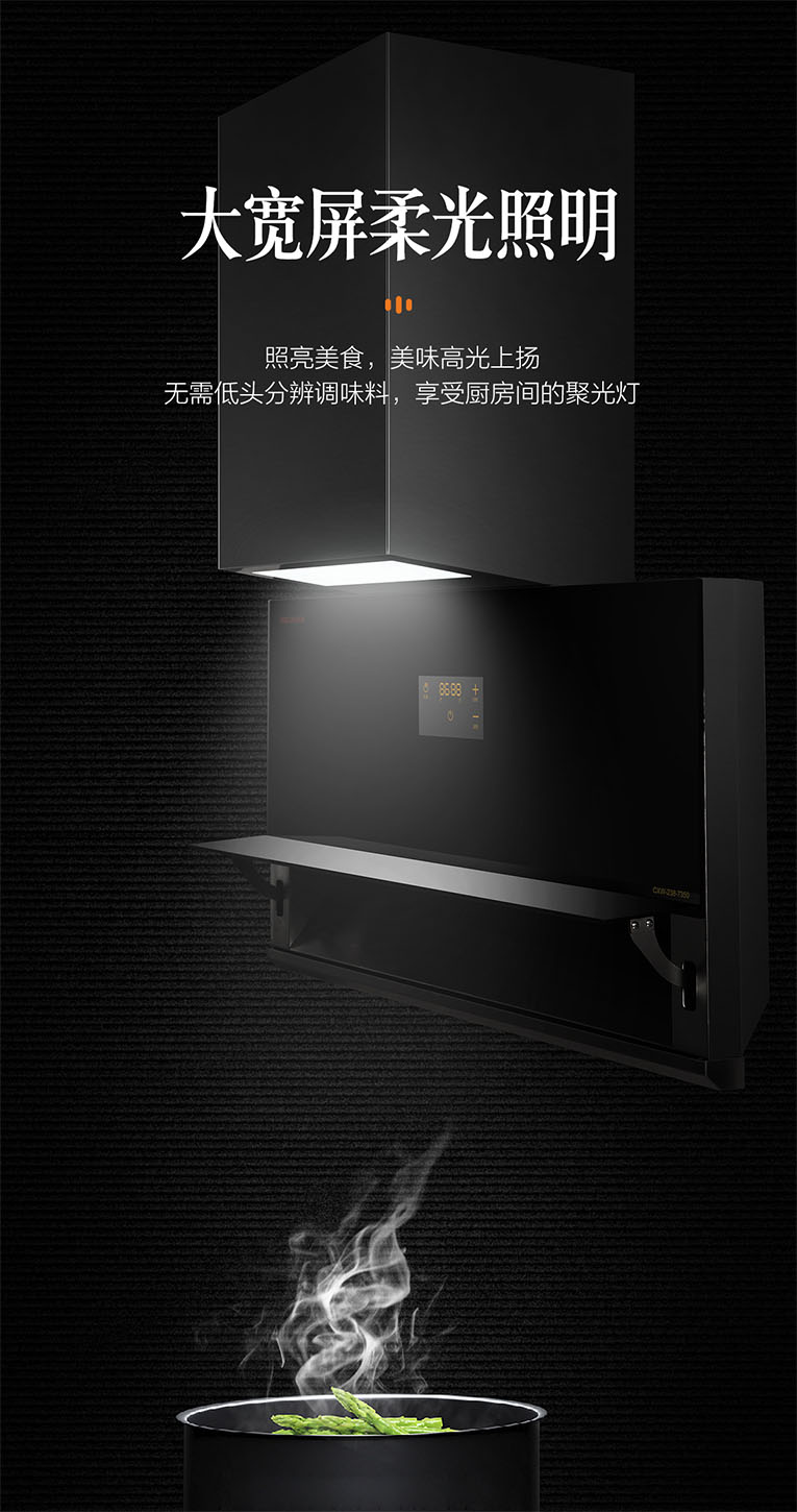 上方采用大寬屏柔光照明,發(fā)光均勻無暗影,照亮美食,美味高光上揚,無需低頭分辨調(diào)味料,享受廚房間的聚光燈。