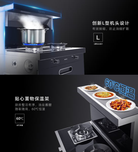 創新L型機頭設計,寬域攏煙,防止油煙擴散,LED節能照明燈,聚焦視線,沉浸舒適氛圍,60℃恒溫置物臺 ,從此冷菜是路人,廚房整潔有序,油鹽醬醋隨拿隨放。