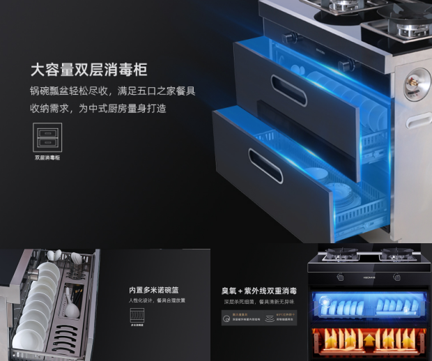 大容量雙層保潔柜,為中式廚房量身打造,鍋碗瓢盆輕松盡收,滿足五口之家餐具需求。內置多米諾碗籃隨用隨取,擺放更合理,保潔收納一步到位。臭氧+紫外線雙重消毒,深層殺死細菌,餐具久放無異味,高濃度臭氧,深層破壞細菌內部結構,65℃紅外恒溫烘干,抑制細菌再生,杜絕二次污染。