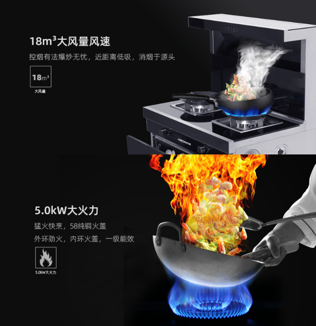 5.0kW大火力,58純銅火蓋猛火快烹,外環勁火,一級能效18m3颶風吸力,低空近吸,控煙有道,爆炒無憂。