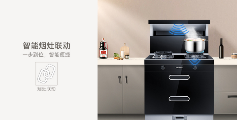 智能煙灶聯動,煙灶互聯,風隨火動,一步到位,人性化設計,智享烹飪新體驗。