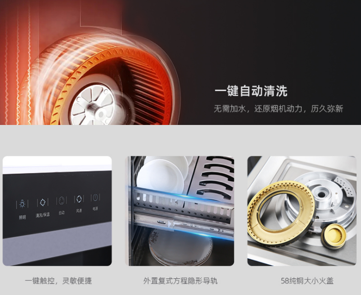 貼心細節,匠心呈現:一鍵自動清洗功能,無需加水,內部快速去污,還原煙機動力,歷久彌新。