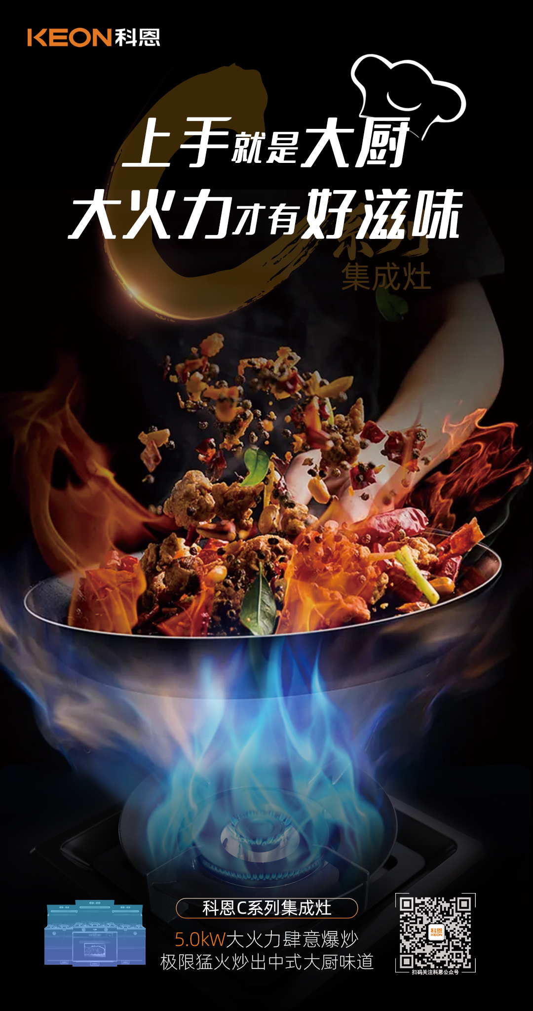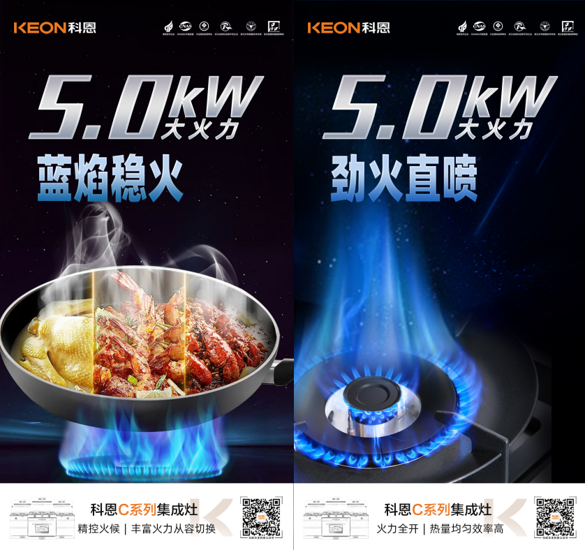 科恩C系列集成灶,5.0kW黃金大火力,輕松實現(xiàn)爆炒自由,縱情沉浸美好烹飪新體驗!