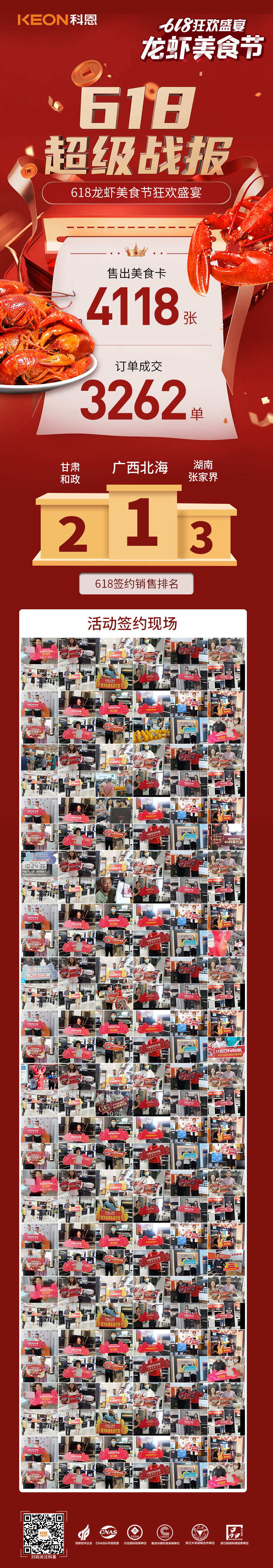 夏日最火的美食非小龍蝦莫屬,科恩集成灶借勢小龍蝦的social熱點(diǎn),在這個(gè)618年中鉅惠大熱之際,以一場為期近30天的龍蝦美食節(jié)吹響夏日號(hào)角,掀起一陣狂歡浪潮。千城千店,共襄盛舉,全國各地消費(fèi)者們共赴科恩龍蝦美食宴,隨著6月18日晚直播大抽獎(jiǎng)活動(dòng)的結(jié)束,科恩龍蝦美食節(jié),也畫上了一個(gè)圓滿的句號(hào)。截止6月18日23:59分,科恩集成灶共計(jì)售出4118張美食卡,訂單成交3262單,如此優(yōu)秀成績,充分印證了科恩電器的產(chǎn)品品質(zhì)和優(yōu)質(zhì)口碑!