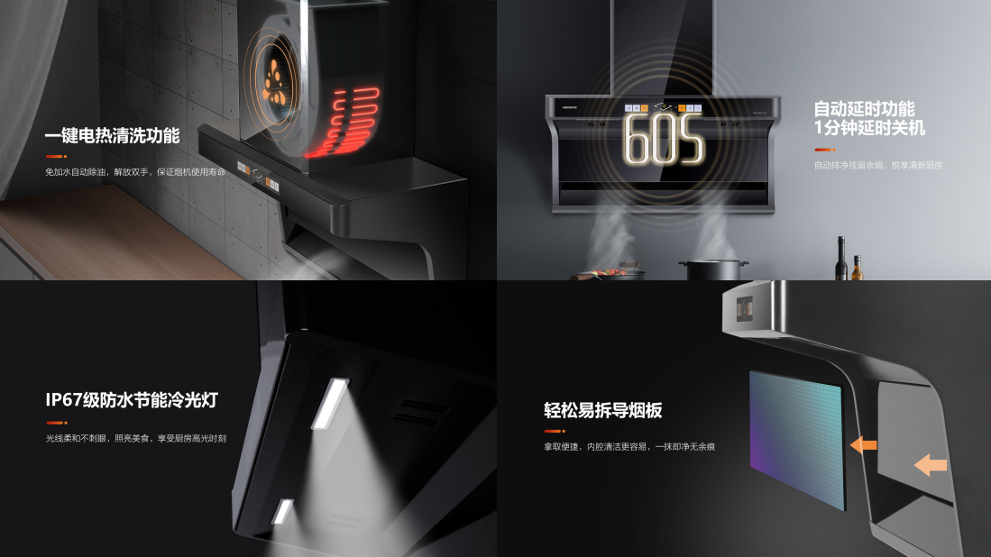 ◆一鍵電熱自清潔功能,自動(dòng)電加熱溶解油污,高速甩干速凈,免加水自動(dòng)除油,解放雙手的同時(shí),更能延長煙機(jī)的使用壽命、保持大吸力,歷久彌新!