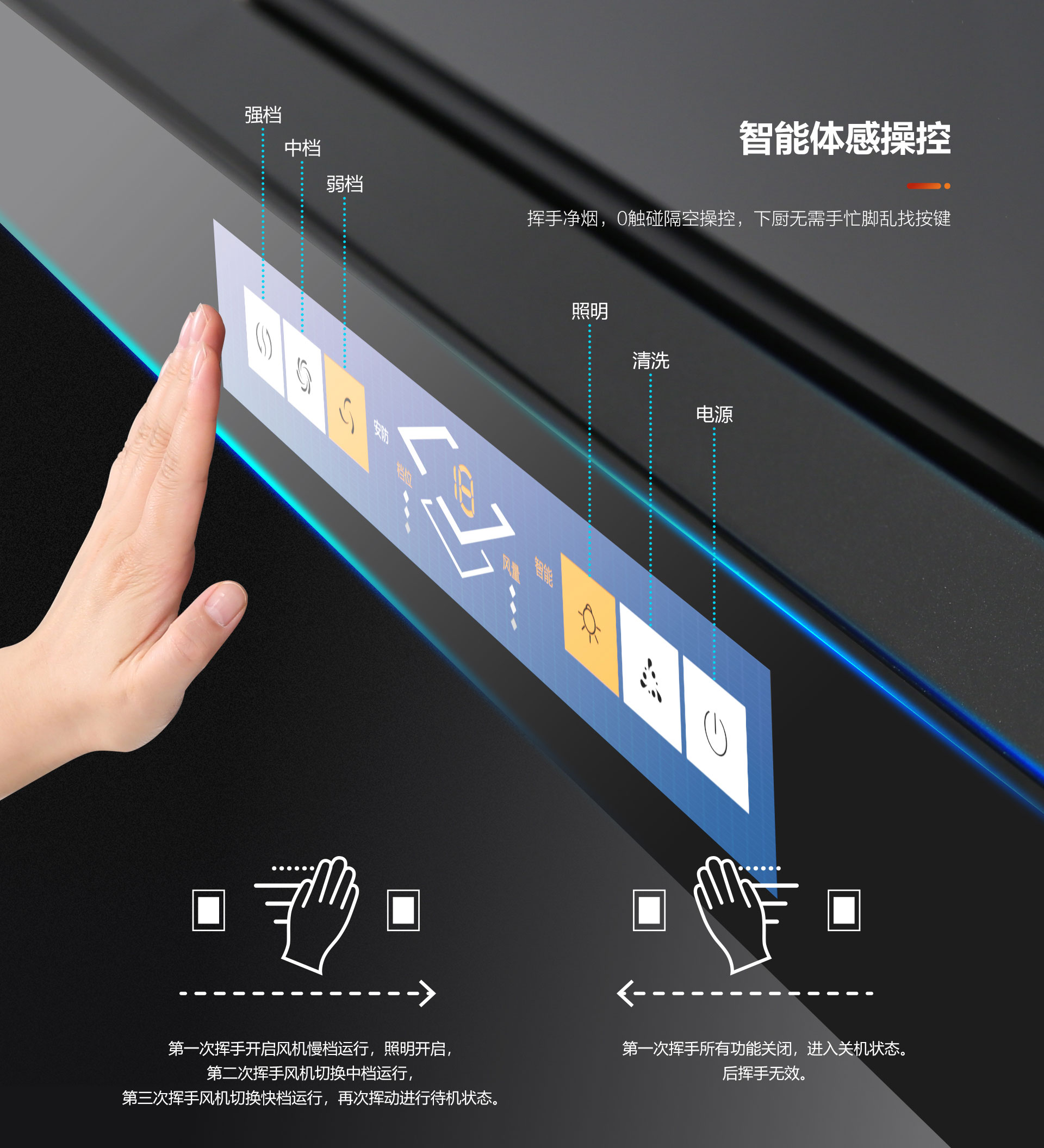 ◆智能體感操控系統(tǒng),無需觸碰煙機(jī),揮手凈煙,告別繁瑣清潔步驟,更能有效避免手濕油膩導(dǎo)致的觸控不靈敏問題,煙機(jī)不留油污、手印,面板時(shí)刻干凈免潔!