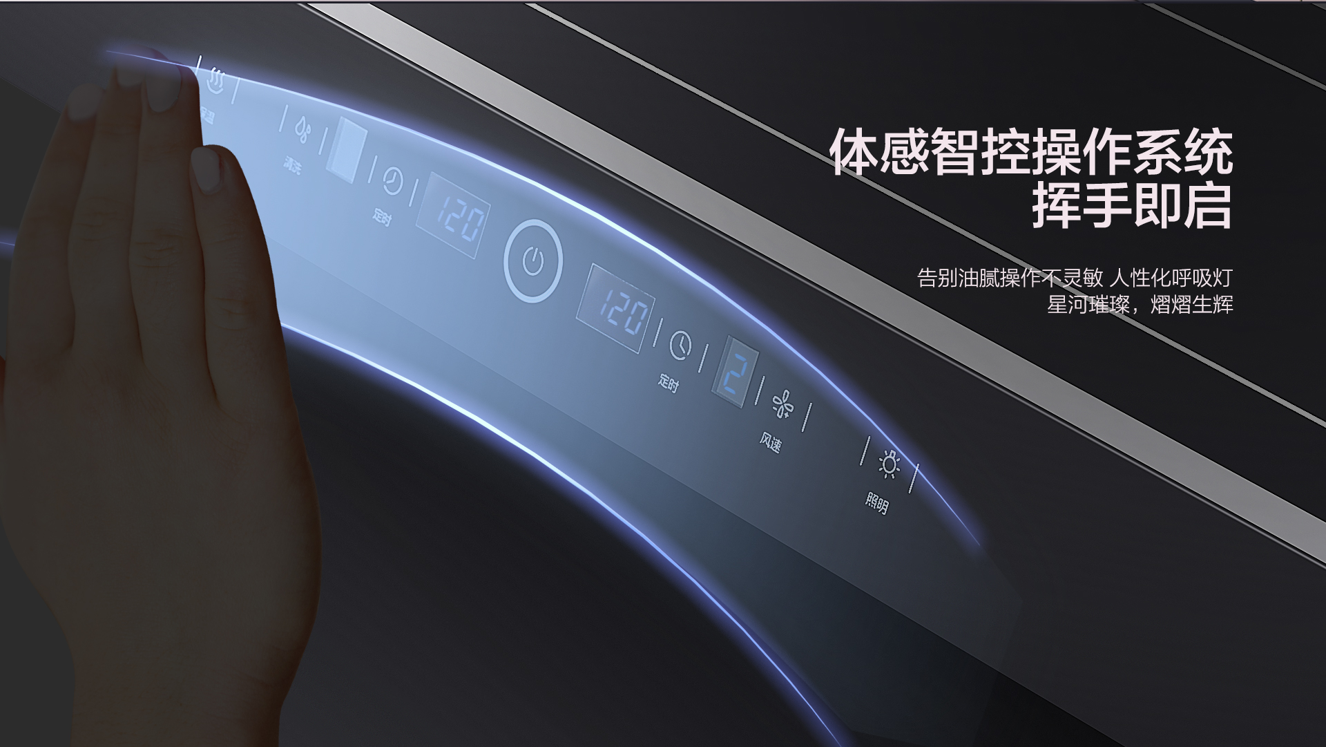 ◆體感智控操作系統,揮手即啟,老人也可輕松使用,從此告別油膩雙手導致的煙機按鍵不靈敏,專心烹飪,再無手忙腳亂的煩惱!