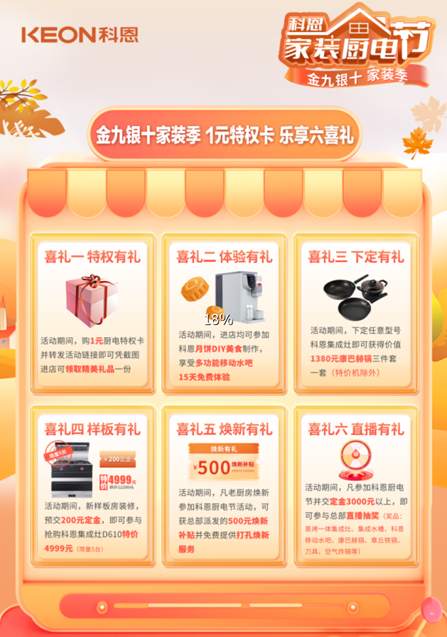 金九銀十科恩家裝廚電節(jié),1元特權卡,樂享六喜禮,還有超多精彩福利安排,這個假期等你來嗨!