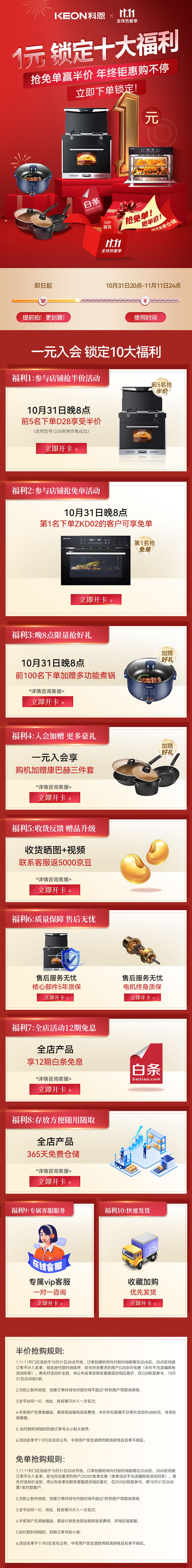值得一提的是,本次雙11活動,科恩集成灶采取雙線聯動營銷戰略,通過各大電商平臺多矩陣齊發,讓消費者不僅在線上享受搶免單贏半價的快樂,更能在線下實體店感受沉浸式雙11超值鉅惠的樂趣!在為終端門店帶來客流量的同時,也為消費者提供了更便捷和貼心的購買方式!
