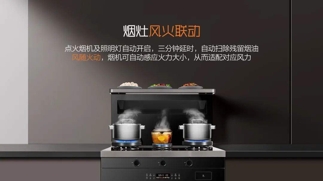 同時,A3在煙灶聯動功能上做了升級。A3系列打開灶具的同時煙機與照明燈同時打開開啟,且煙機可根據火力大小自動調節,無需再手動調節,風隨火動廚房更智能。