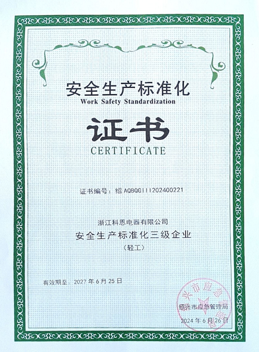 近日,浙江科恩電器有限公司經過嚴謹細致的現場評審后,成功獲得“安全生產標準化三級企業”稱號,此項殊榮是對其一直秉持并堅守的安全生產管理策略以及企業文化的積極肯定。