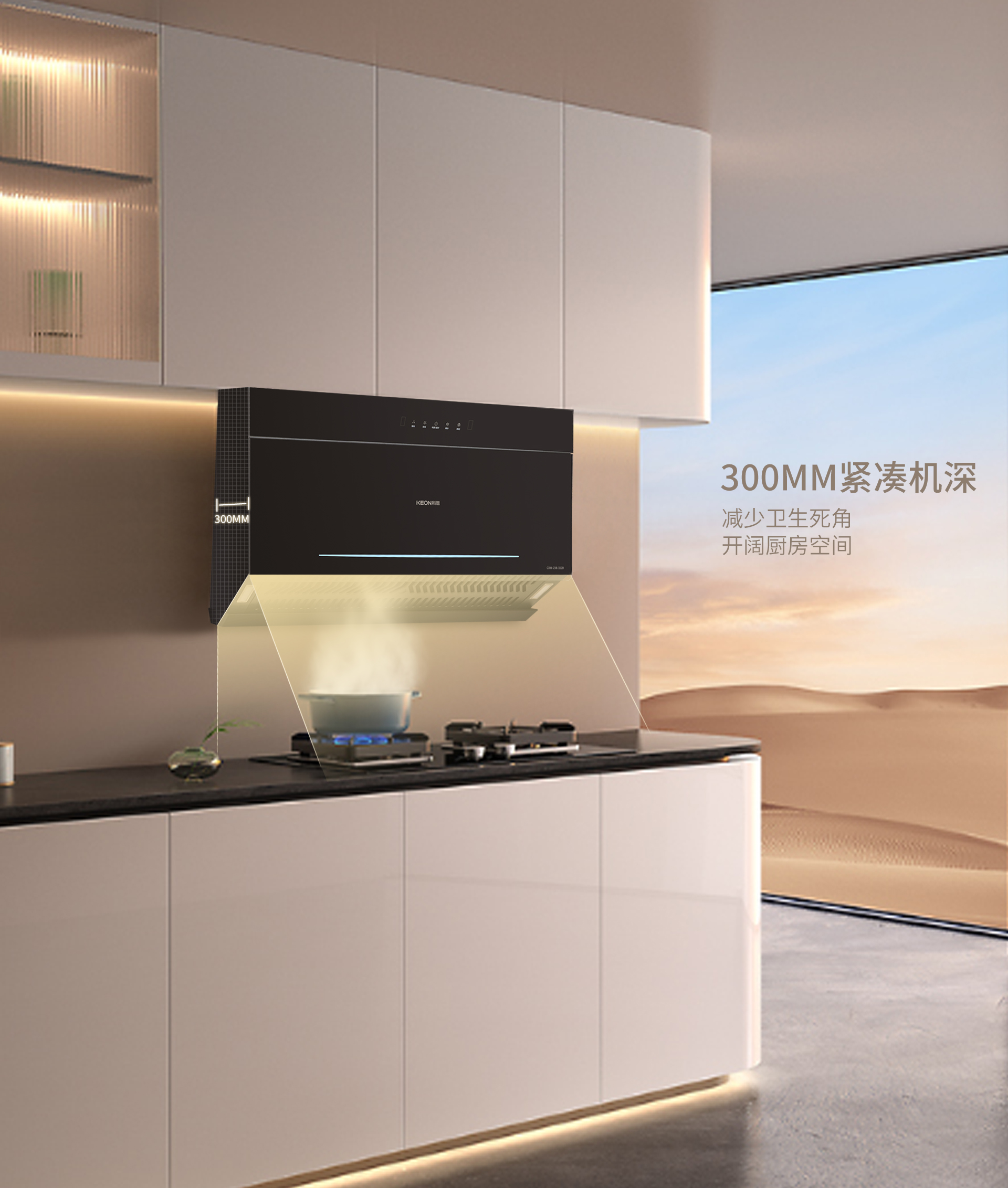 此外,科恩3320煙機(jī)的攏、吸、排三點(diǎn)一線設(shè)計(jì),實(shí)現(xiàn)了暢吸直排,高效凈煙。無圍板直排設(shè)計(jì)釋放了更多櫥柜空間,讓廚房更加整潔寬敞。