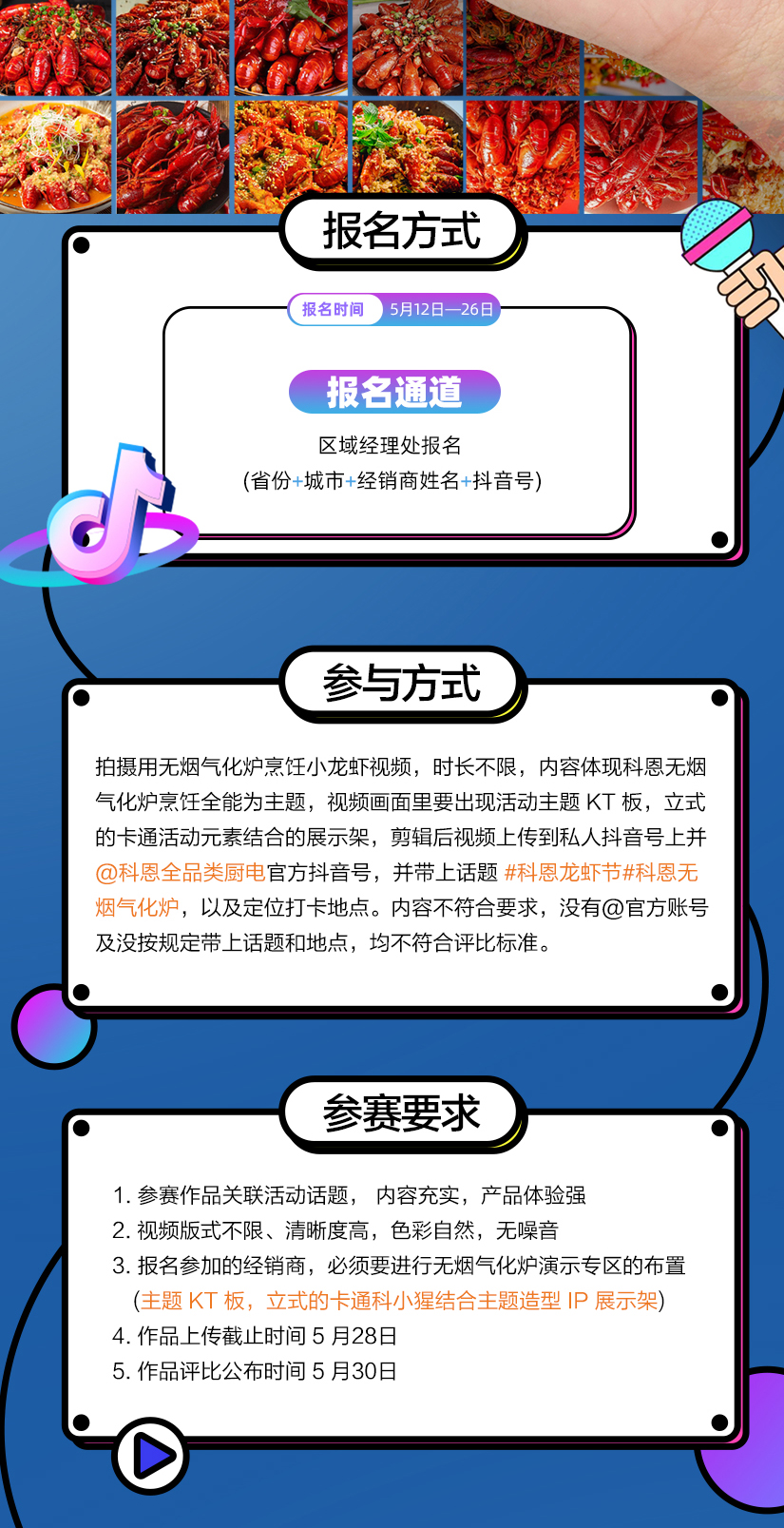 五月的煙火氣,藏在小龍蝦肥美的蝦鉗里,藏在氣化爐的勁焰猛火中,爐力全開(kāi),鉗動(dòng)江湖。5 月12日——5月26日,一場(chǎng)舌尖與視覺(jué)的雙重盛宴拉開(kāi)序幕!科恩龍蝦節(jié)抖音短視頻PK大賽重磅來(lái)襲,誠(chéng)邀全國(guó)科恩專賣店,共赴這場(chǎng)創(chuàng)意與實(shí)力的較量,用鏡頭記錄無(wú)煙料理的無(wú)限可能。