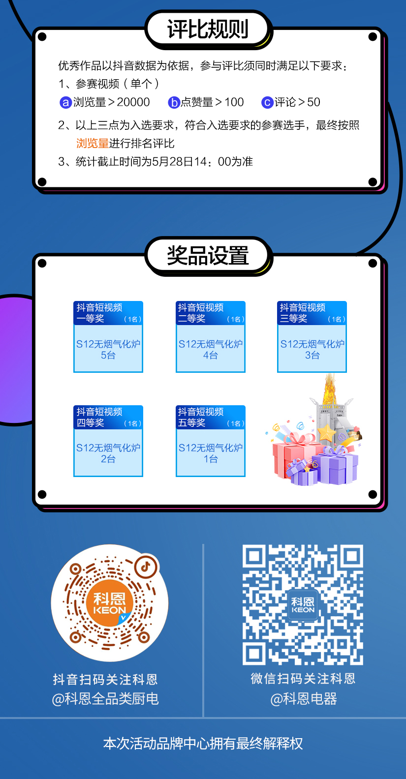 江湖風(fēng)云起,爐火論英雄。快收藏這份規(guī)則秘籍。福利升級(jí),獎(jiǎng)品豐厚,煥新好禮帶回家。廚房江湖,等你來(lái)戰(zhàn)。@科恩全品類廚電官方抖音號(hào),帶上話題 #科恩龍蝦節(jié)#科恩無(wú)煙氣化爐,定位打卡地點(diǎn),即刻點(diǎn)燃爐火,舉起鏡頭,用一場(chǎng)色香味俱全的短視頻盛宴。搶占今夏流量C位!