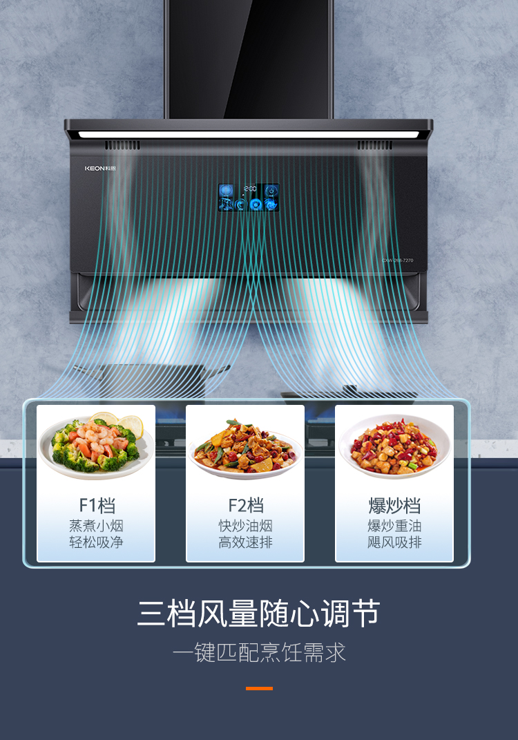 頂側雙吸的設計,精準直卷雙灶濃煙,實現 1+1>2 的強力凈煙效果。25m³/min 大吸力,無懼中式爆炒,895×468mm 超寬屏攏煙,全方位覆蓋雙灶,讓油煙無處可逃。三檔風量隨心調節,無論是小火慢燉,還是大火爆炒,都能一鍵匹配最佳吸力,7270煥新廚房清新空氣。