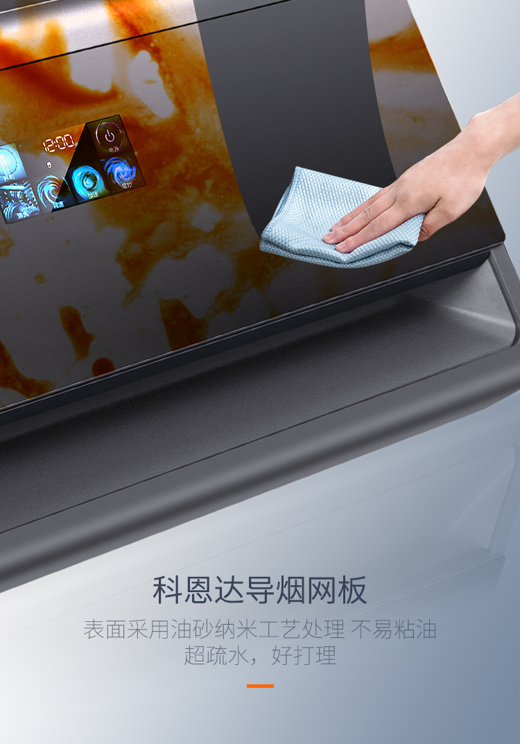 7270整機采用特氟龍工藝,一體拉伸沖壓成型,美觀大氣,一擦即凈。磁吸式科恩達網板,一拉一提,拆卸清洗簡單方便,科恩達網板表面采用油砂納米科學工藝,讓油污難以附著,超疏水自清潔。電加熱清洗功能,自動甩掉油污。保持煙機強勁吸力,清潔不再是難題。