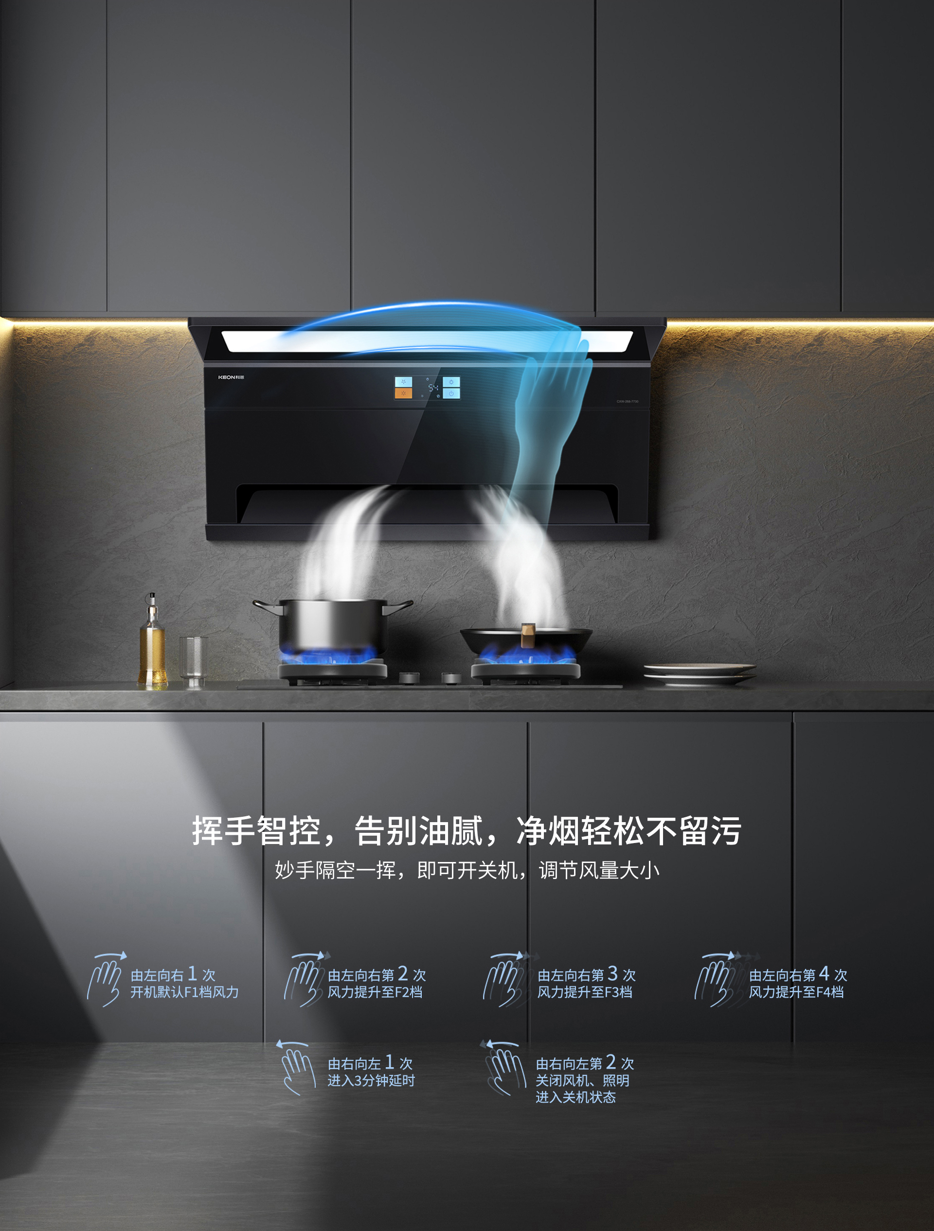智能操控,告別油膩接觸。揮手即能掌控,雙手不沾油污,隔空一揮開關(guān)機、調(diào)風量,模塊化彩屏觸摸鍵,老人也能輕松操作,煙灶聯(lián)動,火起煙凈,打造智能便捷的廚居生活。