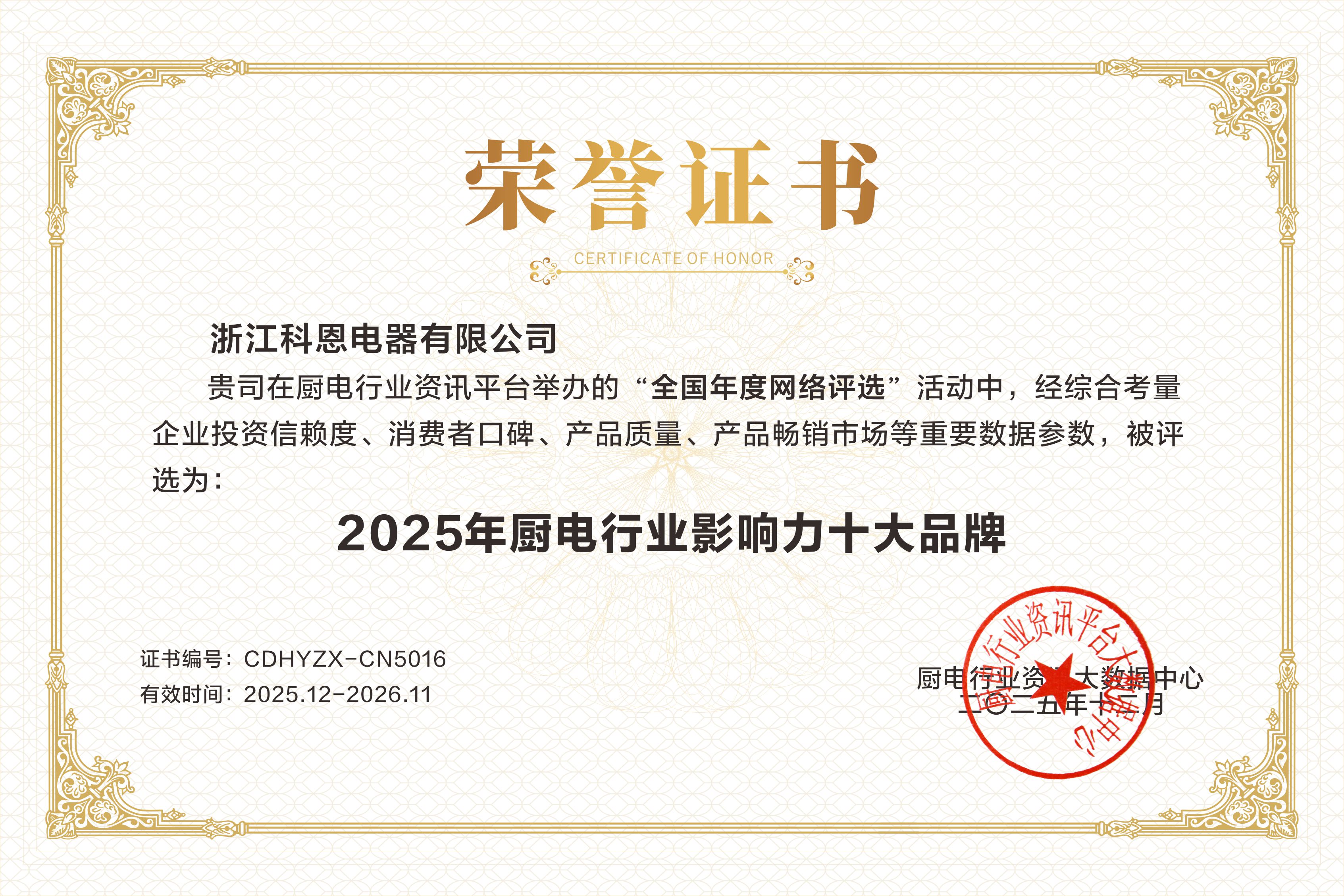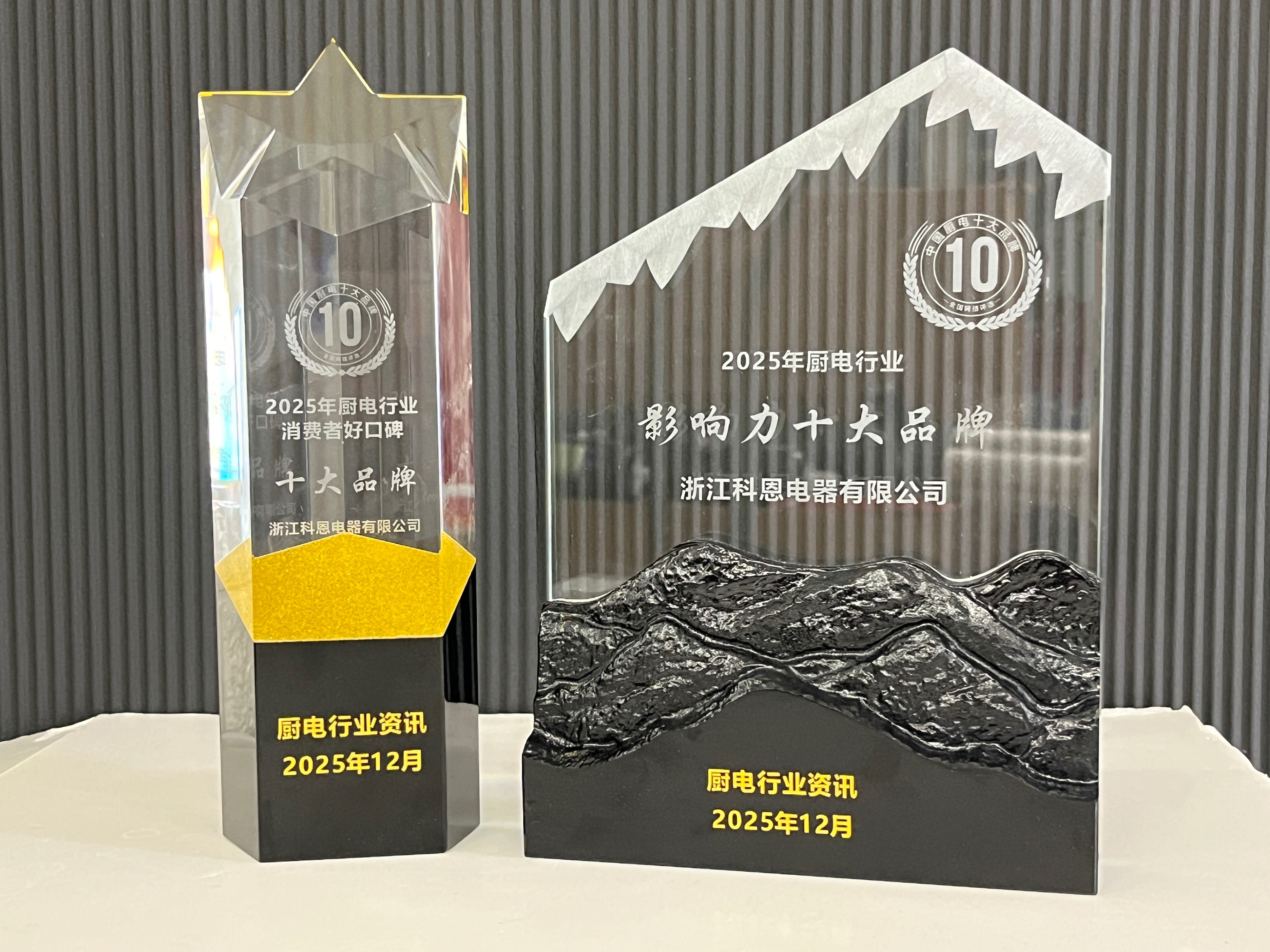 雙冠加冕!科恩電器榮獲2025廚電行業十大品牌殊榮