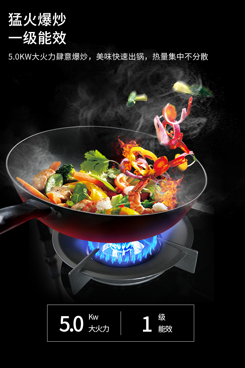 精控勁火,1級能效,5.0KW大火力肆意爆炒,美味快速出鍋。