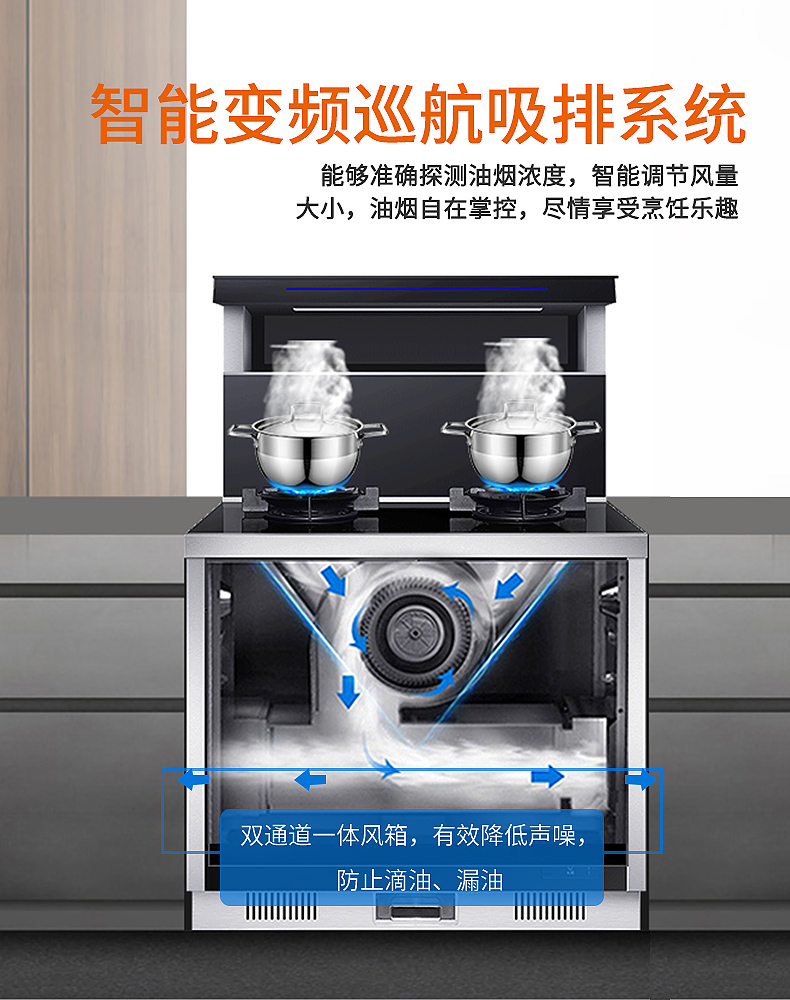 智能巡航吸排系統,準確探測油煙濃度,智能調節風量大小。