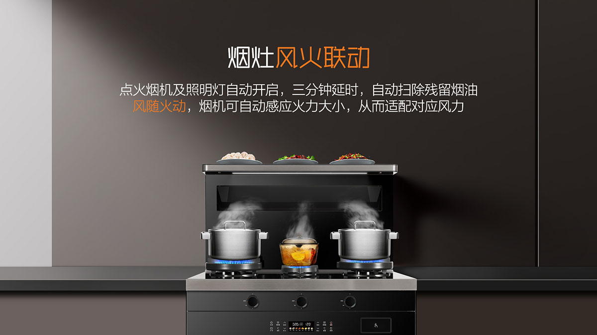 - 煙灶風火聯(lián)動,點火煙機自動開啟,風量隨火力大小自動調(diào)節(jié)