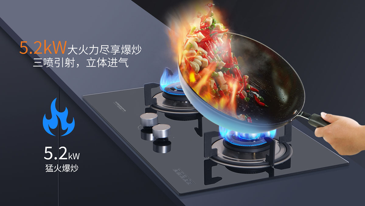 • 三噴引射,立體進氣,5.2kW大火力盡享爆炒